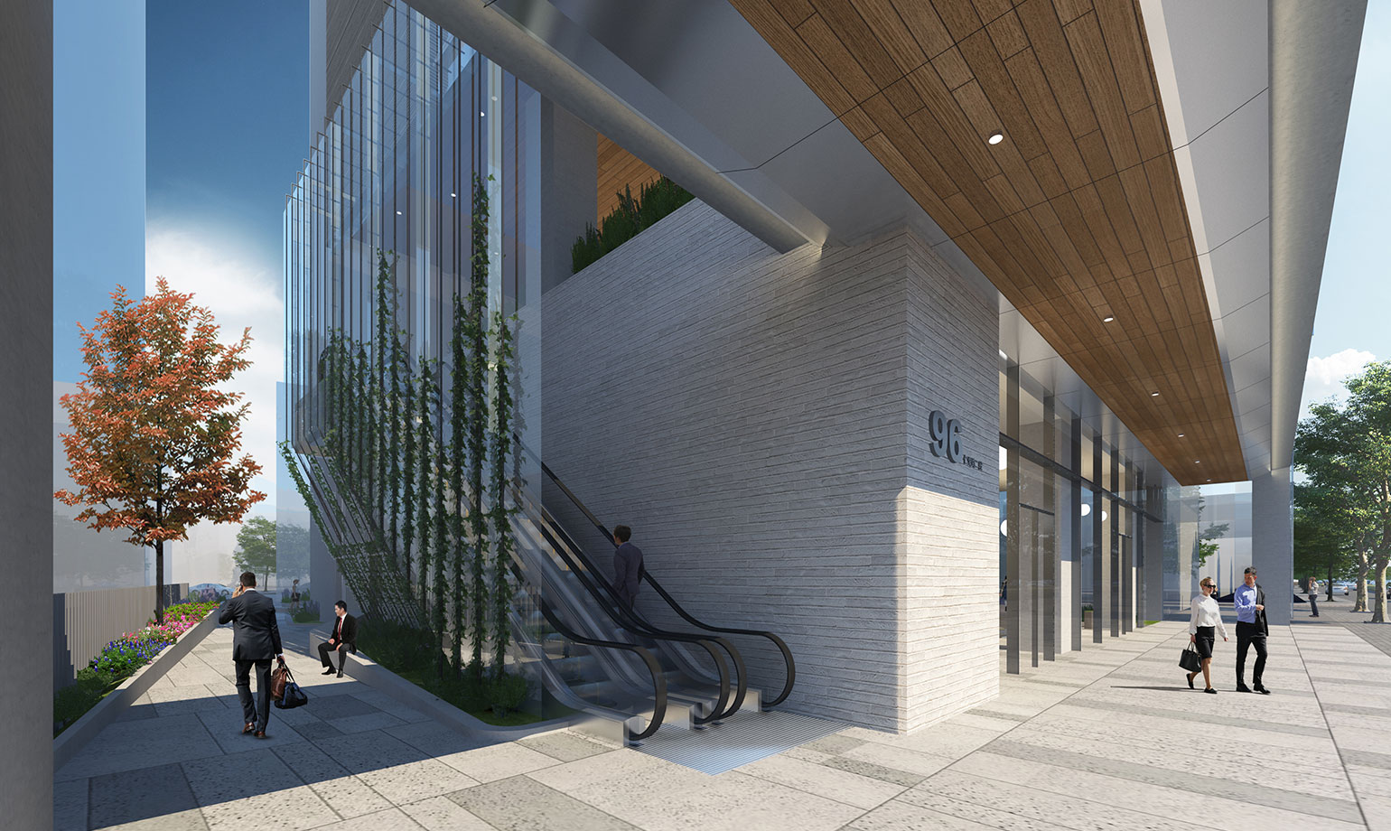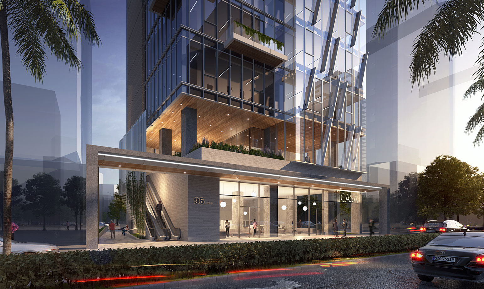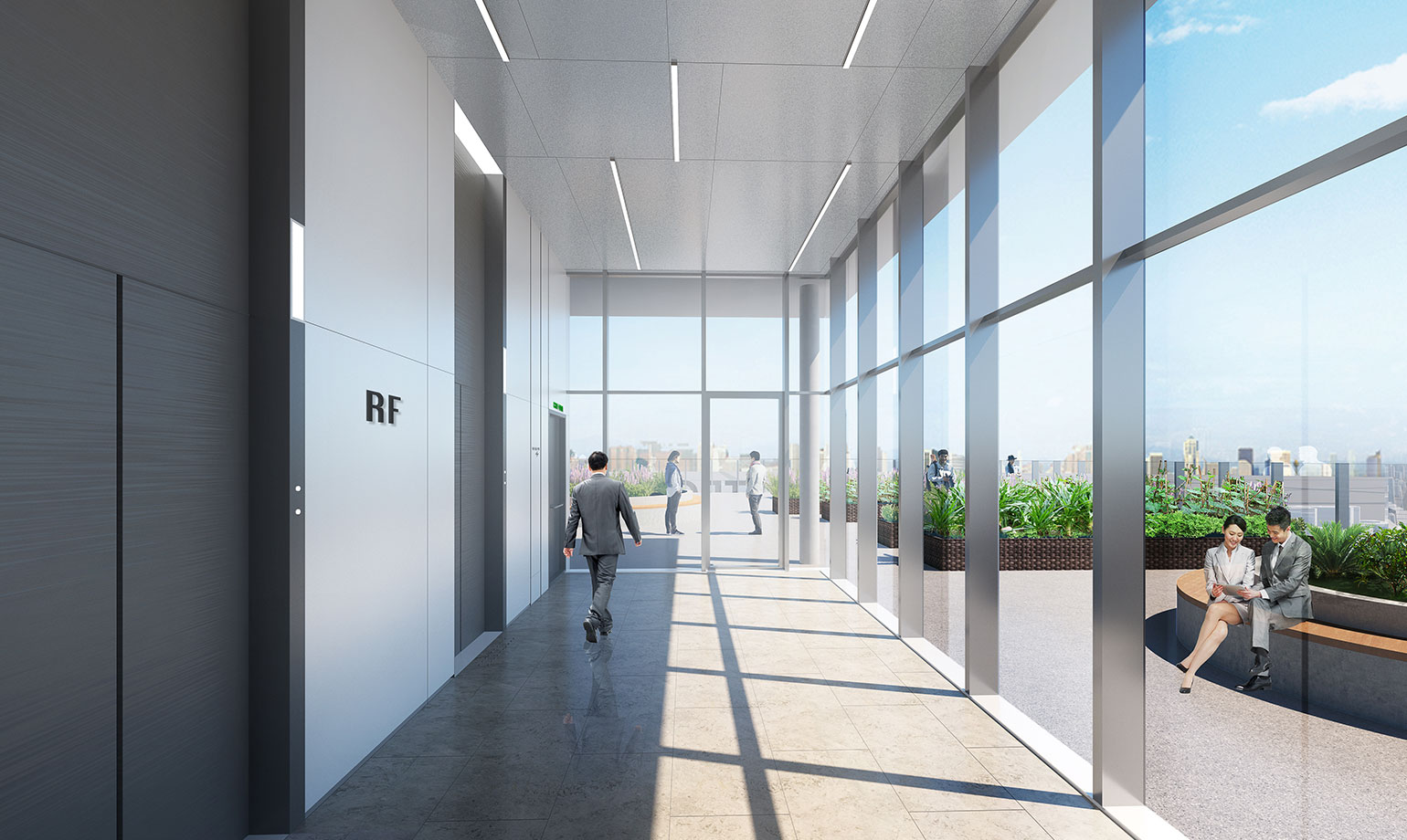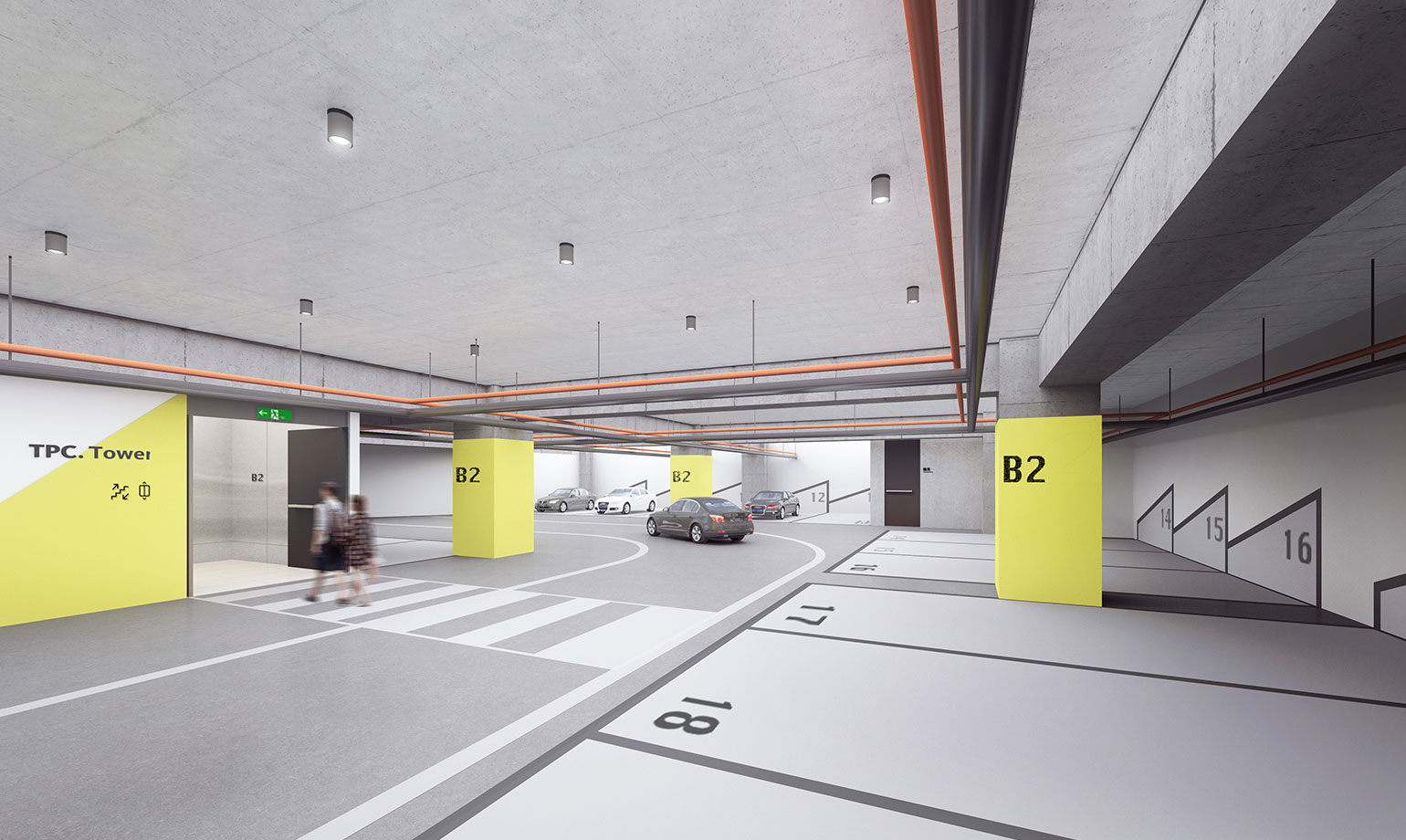 1.退縮騎樓:建築量體退縮留設騎樓空間形成店面停留展現區,同時區分辦公與商業量體。