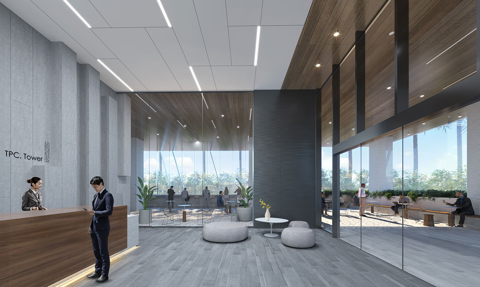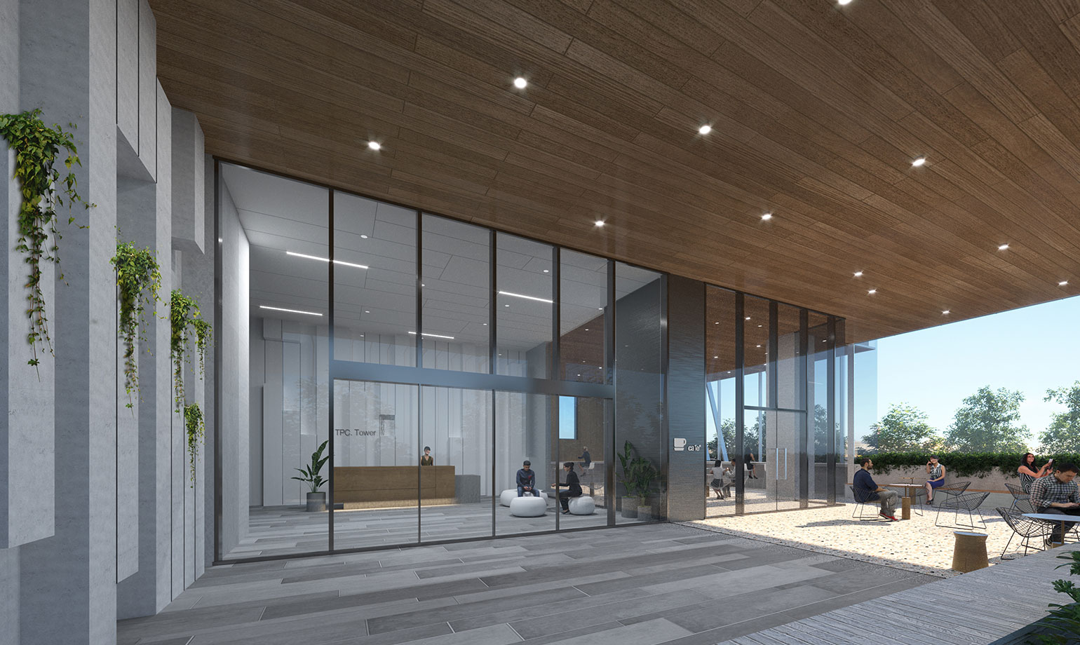 2.打開量體開口,創造辦公入口:為保持商業店面展開,將辦公空間之入口門廳移至二樓,並將部分量體退縮形成一半戶外空間。