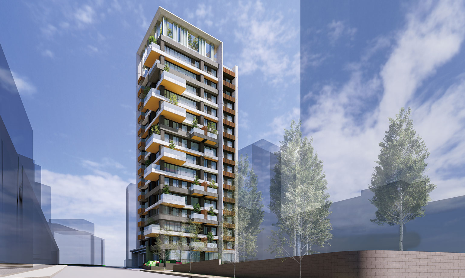 在外觀上,利用二至十五樓為一層兩至三戶的特性,配合立面的陽台錯落、皮層變化,展現出建築自明性。